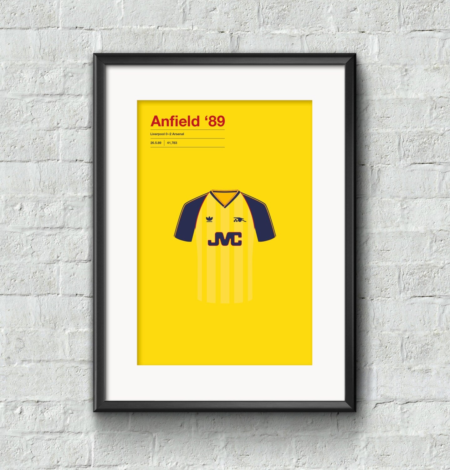 This design pays graphical homage to the famous shirt worn by Arsenal players on that famous title winning night in 1989. Together with key information (score/date/attendance) this is a beautifully unique piece of nostalgia.