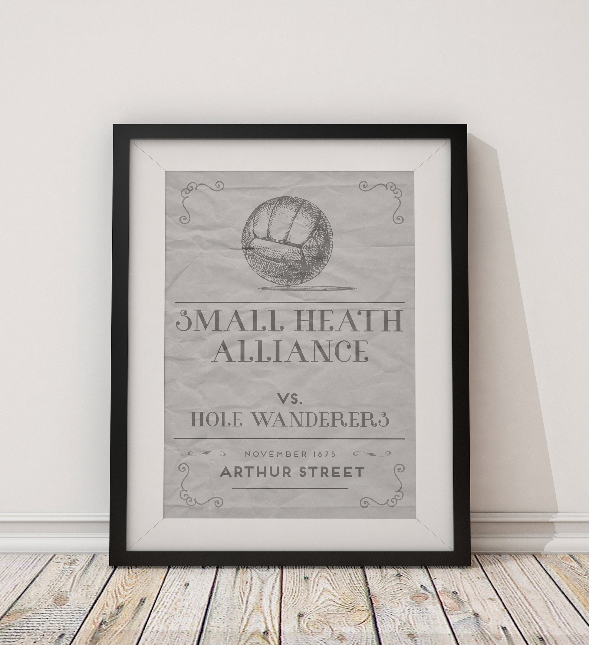 This vintage style poster displays the first recognised game Birmingham City FC (Then Small Heath Alliance) played. The game was played at Arthur Street in November 1875 against Hole Wanderers.