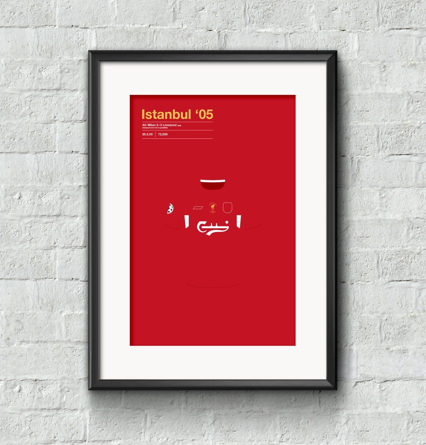 This design pays graphical homage to the famous shirt worn by Liverpool players on that famous Champions League winning night in 2005. Together with key information (score/date/attendance) this is a beautifully unique piece of nostalgia.