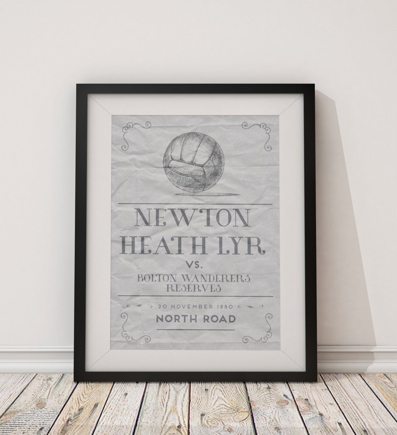 This vintage style poster displays the first recognised game Manchester United played. Formed as Newton Heath in 1878 before becoming Manchester United in 1902. The game was played at North Road on the 20th November against Bolton Wanderers.