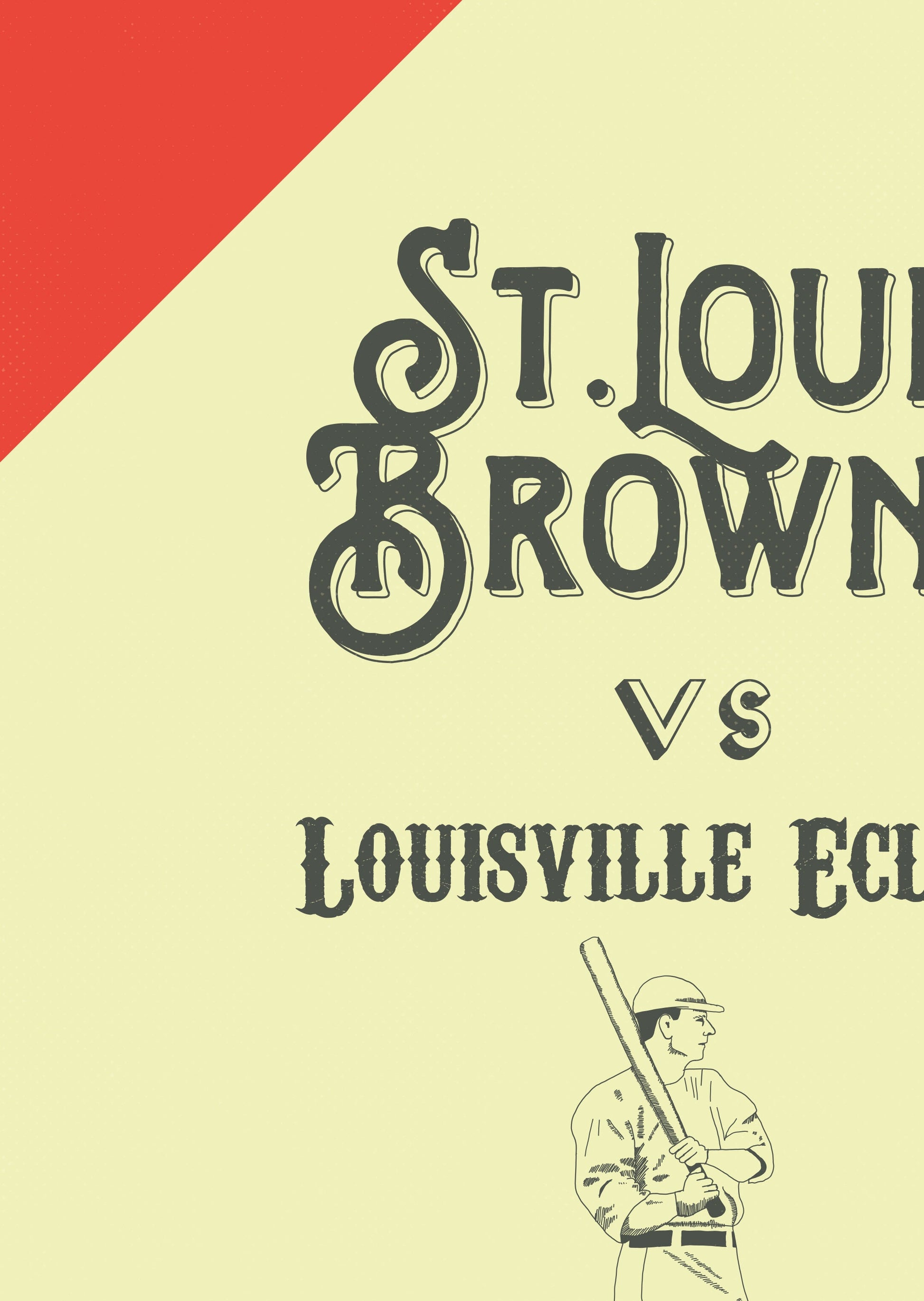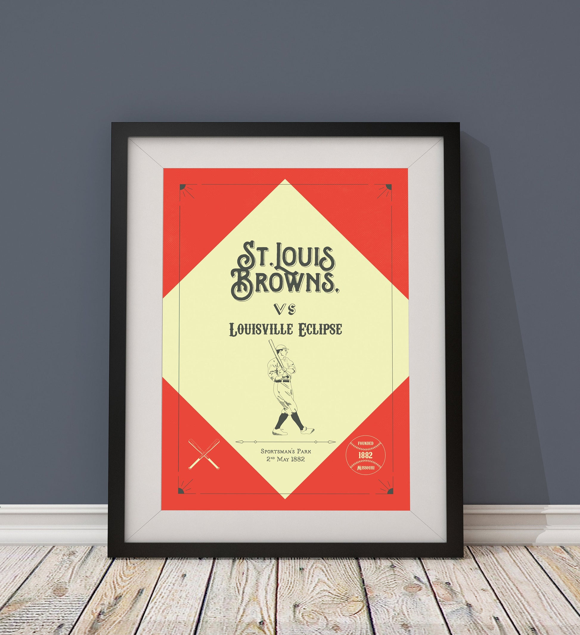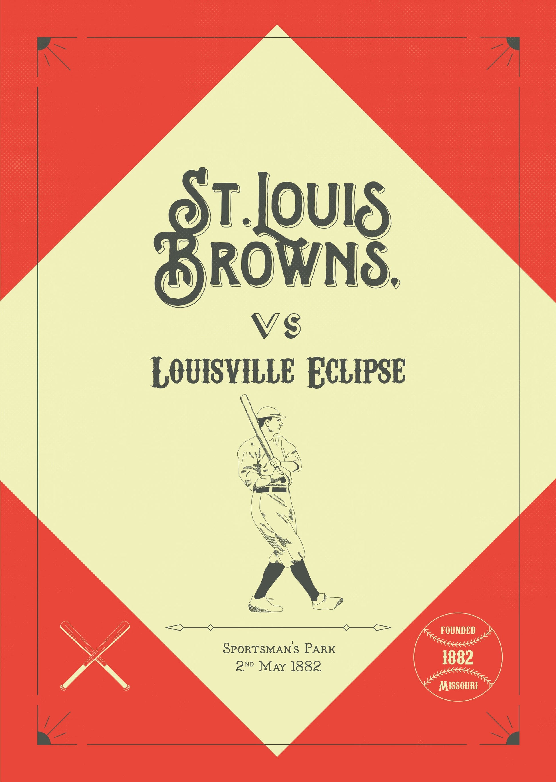 This vintage style poster displays the first recognised game the St. Louis Cardinals played, then known as St. Louis Browns. The game was played at Sportsman's Park on 2 May 1882 against Louisville Eclipse.